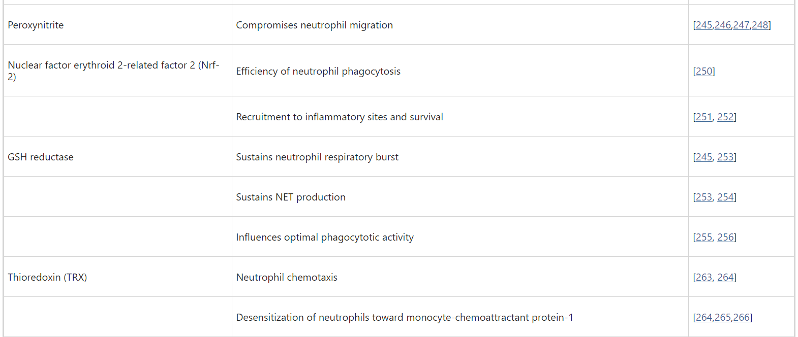 TRX는 감염된 세포 및/또는 염증 조직에서 방출되어 호중구 화학 주성 조절에 중요한 역할을 합니다[263, 264]. 이 효과는 MCP-1에 대한 호중구의 탈감작으로 인한 것으로 보이며[264, 265], 염증 조직으로의 호중구 모집을 억제합니다[266]. 관련된 메커니즘은 완전히 이해되지는 않았지만 적어도 부분적으로는 TRX 단백질 내의 기능성 시스테인 잔기의 산화 상태에 의존하는 것으로 보입니다 [264].