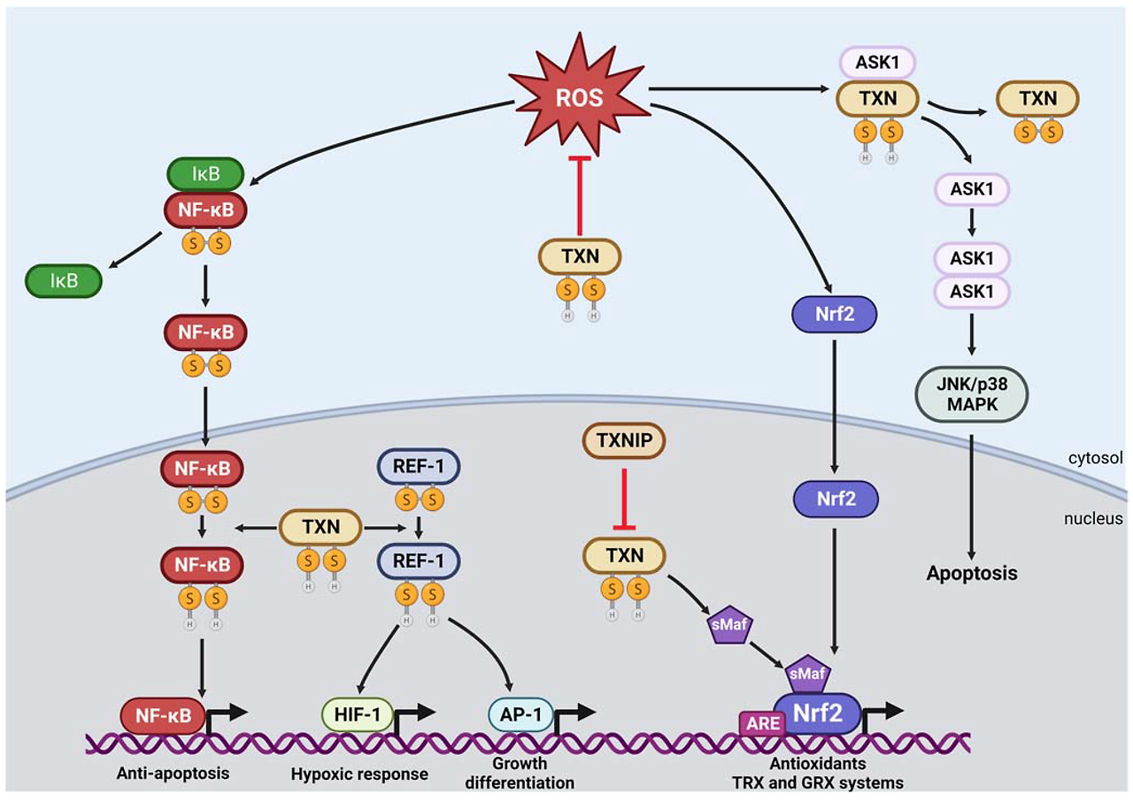 The TRX system activity exerts a range of influences on T-cell proliferation and activation via increased TRX-1 production. This restrains their stimulation and encourages the development of Tregs from naive T cells, decreasing their differentiation down the Th-1 and Th-17 pathways [326]. TRX-1 upregulation is important in enabling T effector and Treg cell survival and function during chronic nitro-oxidative stress by protecting membrane protein thiols from oxidation [327, 328]. Increased TRX-1 activity is needed to maintain the production of IL-2 [329] and Th-mediated activation of B cells [330].