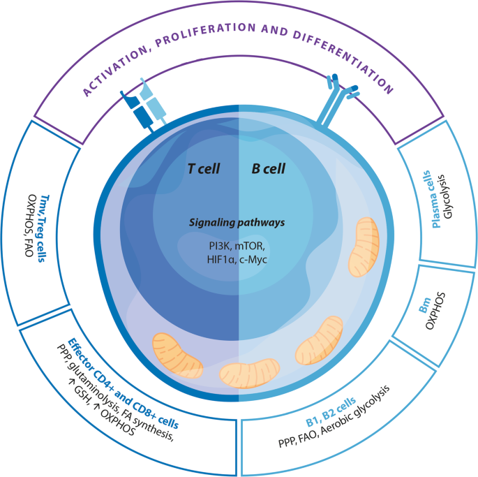 Metabolic reprogramming of T and B cells. Tm cells memory T cells, Treg cells regulatory T cells, OXPHOS oxidative phosphorylation, FA fatty acid, PPP pentose phosphate pathway, GSH glutathione, PI3K phosphatidylinositol 3-kinase, mTOR mechanistic target of rapamycin, HIF1α hypoxia-inducible factor 1-alpha, c-Myc Myc proto-oncogenes, Pl cells plasma cells, Bm cells memory B cells, B1/B2 subclass of B-cells
