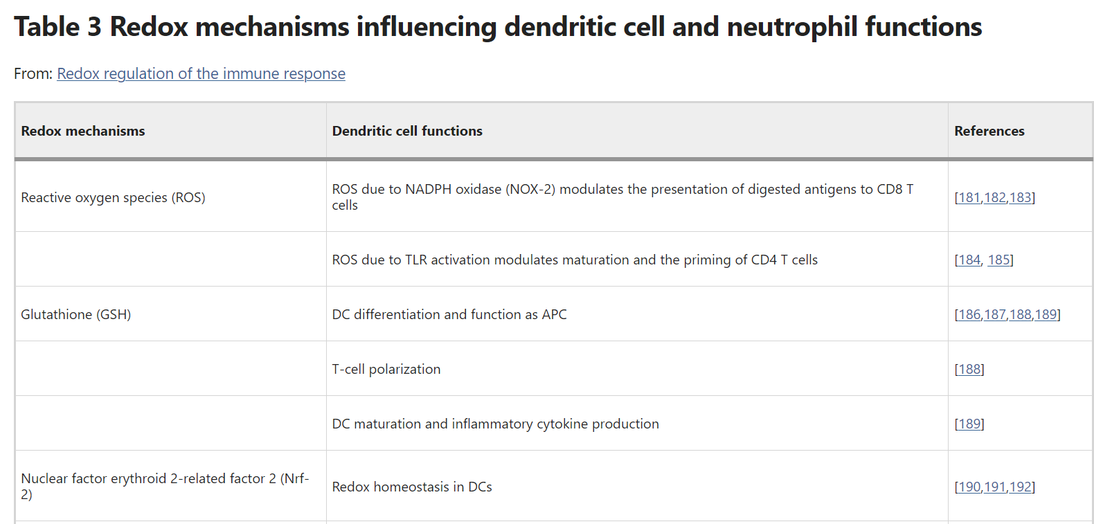 The upregulation of GSH synthesis may enable the proliferation and cytotoxic functions of NK-cells and, conversely, GSH downregulation results in compromised functions and recruitment to sites of inflammation [385,386,387]. In an inflammatory environment, the upregulation of TRX-1 plays a role in NK-cell survival by maintaining membrane cytoprotective sulfhydryl residues in a reduced state [388, 389]. This phenomenon may protect those cells from hydrogen peroxide-mediated NK-cell dysfunctions [388, 389]. However, this level of protection is clearly limited as chronic nitro-oxidative stress may result in NK-cell hypofunction and loss of cytotoxic activity [390,391,392,393]. There is evidence suggesting that this is due to compromised hydrogen peroxide signaling following NOX-2 hyperactivity [390]. However, there is also proof that NK-cell function may be impaired by excessive production of NO [392].