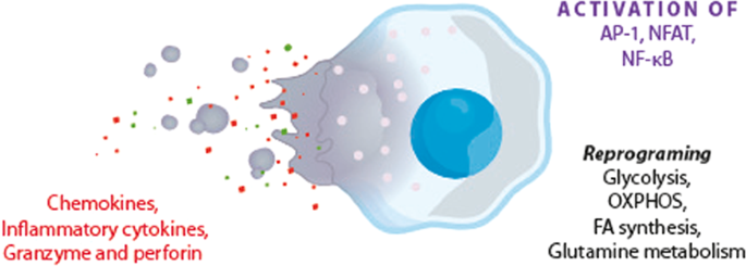 Metabolic reprograming in NK-cells. AP-1 activator protein-1, NFAT nuclear factor of activated T cell, NF-kB nuclear factor NF-kappa-B, OXPHOS oxidative phosphorylation, FA fatty acid