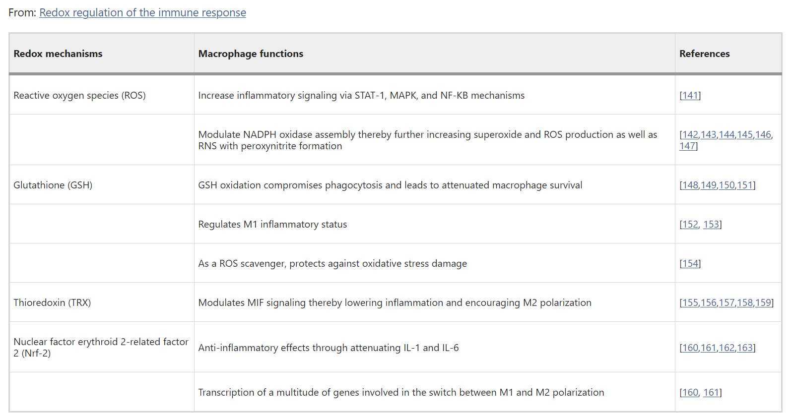 In conclusion, redox-associated mechanisms modulate metabolic reprogramming of immune cells, macrophage and T helper cell polarization, phagocytosis, production of pro- versus anti-inflammatory cytokines, immune training and tolerance, chemotaxis, pathogen sensing, antiviral and antibacterial effects, Toll-like receptor activity, and endotoxin tolerance.