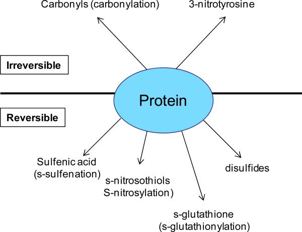 Irreversible and reversible protein oxidation products discussed in this review. Irreversible oxidation includes protein carbonyls and 3-nitrotyrosine while reversible oxidation includes cysteine modification products such as sulfenic acid, nitrosothiols, and s-glutathione.