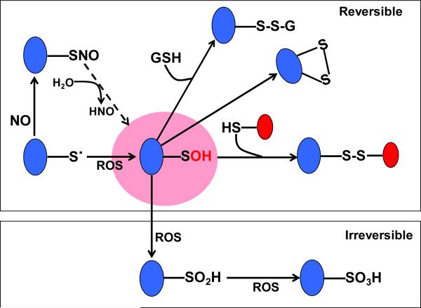 Sulfenic acid is truly an intermediate product during cysteine oxidation. Given appropriate conditions, s-nitrosothiols can also be discomposed to yield sulfenic acids with concurrent production of nitroxyl [137]. Sulfenic acid can be further oxidized to form disulfide bonds, s-glutathionylation. Irreversible oxidation products sulfinic and sulfonic acids are also shown.