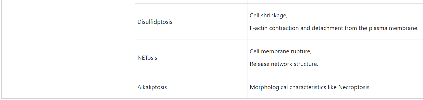 또한 위에서 언급한 틈새 세포 사멸의 형태 중 일부는 별도의 세포 사멸 유형이나 독립적인 신호 경로가 아니라 아포토시스, 네크로옵토시스, 파이로옵토시스 및 페로옵토시스와 같은 일반적인 세포 사멸 과정에서 발생하는 부작용 또는 현상일 수 있다는 점에 주목할 필요가 있습니다.