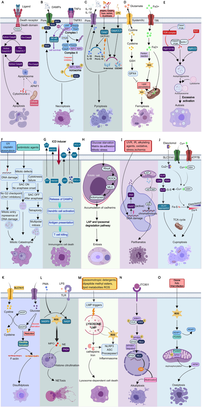 In this article, we reviewed and analyzed the definitions, morphological characteristics, molecular mechanisms, and biomarkers of the main PCD types identified to date, which include apoptosis, necroptosis, pyroptosis, ferroptosis, autophagy-dependent cell death, mitotic catastrophe, immunogenic cell death, entosis, parthanatos, ferroptosis, disulfidptosis, NETosis, lysosome-dependent cell death, alkaliptosis, and oxeiptosis (Fig. 1), and briefly described the role and prospects of these major types of PCD in related diseases.