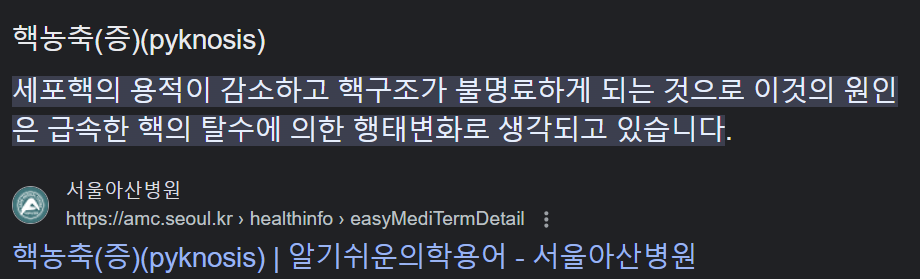 세포 위축, 염색질 농도 및 혈장막 파열입니다.