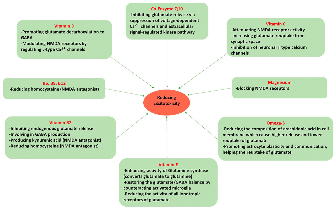 Dietary factors may be one of the most important modifiable lifestyle components for treating migraines. There are specific micronutrients that protect against excitotoxicity caused by excess glutamate. These same micronutrients have also shown promising efficacy in migraine reduction in clinical settings. These nutrients are reviewed below (Figure 2 illustrates the protective mechanisms for each nutrient against excitotoxicity).