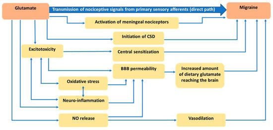 Notably, besides being an endogenous source, glutamate is a non-essential amino acid found in the diet [222]. In a normal situation, the amount of dietary glutamate entering the brain is regulated by saturable transporters on the BBB [223]. However, considering the probability of diminished BBB integrity in migraine patients [224,225,226,227,228], it is likely that the amount of dietary glutamate entering the brain is higher than in healthy individuals. This idea is supported by multiple studies that have shown that MSG administration can induce headaches [229,230,231]. Moreover, some dietary components could have a triggering effect on a migraine attack as reported by patients in epidemiological studies [232,233]. The contribution of dietary triggers in migraines was the basis for the development of elimination diet strategies [234]. However, precisely determining random food triggers is challenging, and a diet that is overly restrictive can have a long-term negative effect on nutritional status [235,236]. Until now, no specific diet has been developed for migraine prevention, and several proposed diets have shown varying levels of efficacy [237]. Taken together, both dietary triggers and nutrient intake might be key to therapeutic benefits in migraine, which has not been possible with current interventions.