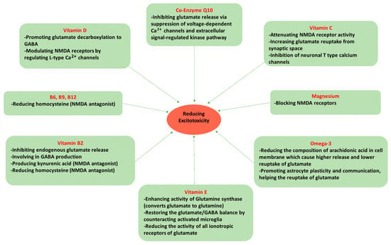 In vitro evidence has demonstrated the protective effects of vitamin D against glutamate excitotoxicity [141], which may be partially mediated by vitamin D’s role in gene transcription, affecting the production of key enzymes in the nervous system. Vitamin D deficiency can reduce glutamate decarboxylase levels in the brain. Glutamate decarboxylase is the enzyme that catalyzes the decarboxylation of glutamate to convert it into γ-aminobutyric acid (GABA), the main inhibitory neurotransmitter in the nervous system [142]. Thus, vitamin D can help prevent excitotoxicity indirectly by upregulating the production of the enzyme that increases the conversion of excitatory glutamate into inhibitory GABA. Notably, vitamin D may also reduce excitotoxicity via modulation of NMDA receptors by regulating Ca2+ influx through L-type voltage-sensitive Ca2+ channels [143].