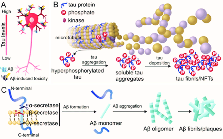 알츠하이머병은 APP, PSEN1, PSEN2 등 Aβ 처리에 관여하는 유전자의 돌연변이로 인해 발생할 수 있습니다 [5]. 그러나 이 질환의 가족 유전성 유전 사례(가족성 AD, FAD)는 전체 사례의 약 2%에 불과합니다[6].
