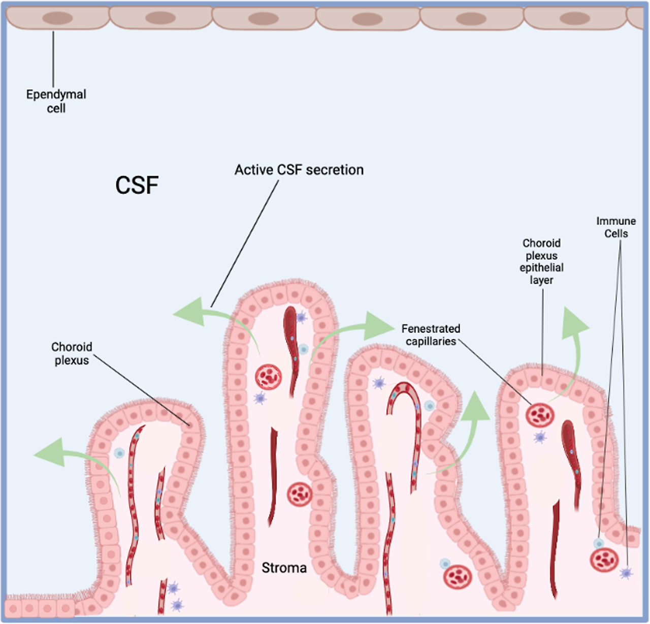 CSF is thought to be produced primarily by the choroid plexuses, which are expansions of the ependymal epithelium, lining the lateral, third, and fourth ventricles [6]. The choroid plexuses are highly folded and vascularized structures consisting of a single layered cuboidal or low cylindrical epithelium residing on a basement membrane. The luminal surface area of the choroid plexus epithelial cells is densely covered by microvilli and possess either one primary cilia or small tufts of motile cilia [4, 7].