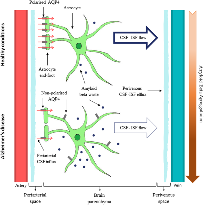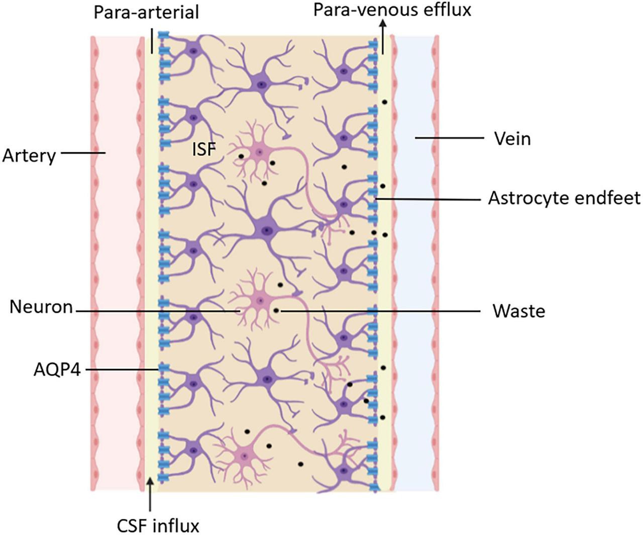 Recent studies have demonstrated that CSF and interstitial fluid (ISF) continuously interchange. This exchange is facilitated by convective influx of CSF along the periarterial space [49]. From the subarachnoid space, CSF is driven into the Virchow-Robin spaces by a combination of arterial pulsatility, respiration, and CSF pressure gradients and the loose fibrous matrix of the perivascular space can be viewed as a low resistance highway for CSF influx. The subsequent transport of CSF into the dense and complex brain parenchyma is facilitated by AQP4 water channels expressed in a highly polarized manor in astrocytic endfeet that ensheathe the brain vasculature [49, 50]. CSF movement into the parenchyma drives convective interstitial fluid fluxes within the tissue toward the perivenous spaces surrounding the large deep veins. The interstitial fluid is collected in the perivenous space from where it drains out of brain toward the cervical lymphatic system [30, 33]. This highly polarized macroscopic system of convective fluid fluxes with rapid interchange of CSF and interstitial fluid was entitled the glymphatic system based on its similarity to the lymphatic system in the peripheral tissue in function, and on the important role of glial AQP4 channels in the convective fluid transport.