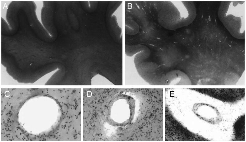 2.5× magnification of hematoxylin and eosin staining of superior frontal gyrus and underlying white matter. A) The white matter of a 74-year old with no CNS diagnosis shows homogenously stained white matter with normal perivascular spaces. B) The white matter of an 80-year old Alzheimer's disease patient contains patches with paler staining and a large number of abnormally enlarged perivascular spaces. 100× magnification of normal C), slightly dilated D) and severely dilated E) perivascular spaces in an Alzheimer's disease patient. Reprinted from [112] with permission.