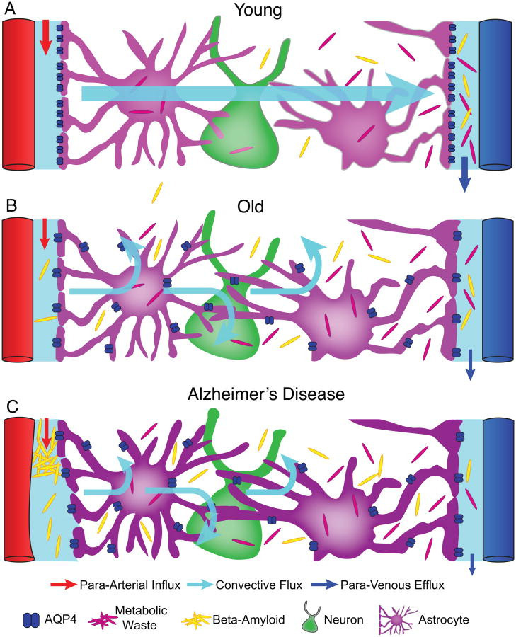 A) In young and healthy people, CSF enters the brain parenchyma via periarterial pathways, washes out solutes from the interstitial space and empties along the veins. B) With aging, glymphatic function is reduced, possibly due to astrocytes becoming reactive and AQP4 de-polarized from the vascular endfeet to parenchymal processes. C) In Alzheimer's disease perivascular space of penetrating arteries are subject to accumulation of β-amyloid peptides. We hypothesize that accumulation of β-amyloid might be caused by impairment of the glymphatic system and that the perivascular pathways are further blocked by protein aggregates such as β-amyloid. In this model, the resulting changes in the perivascular environment lead to abnormal enlargement of perivascular space downstream, which further decreases glymphatic clearance.