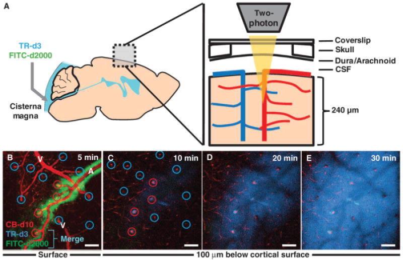 A) Schematic representation of the imaging setup; Periarterial CSF influx of tracers injected in the cisterna magna into the subarachnoid CSF was assessed in vivo using two-photon microscopy through a closed cranial window. Lower bar: Imaging conducted at the cortical surface in 1-min intervals. B) 5 min after injection of small (TR-d3, dark blue) and large (FITC-d2000, green) molecular weight tracers and C-E) 100μm below the cortical surface 10, 20 and 30 min after injection of the tracers. Merge (light blue) indicates co-localization of TR-d3 and FITC-d2000. The cerebral vasculature was visualized with intra-arterial flourescent tracer (CB-d10), and arteries (A) and veins (V) were identified morphologically. Immediately after intracisternal injection, CSF tracer moved along the outside of the pial arteries, but not veins, and after 20-30 min they diffused into the brain parenchyma. Red circles, arterioles; blue circles, venules. Scale bars 100μm. Reprinted from [49] with permission.