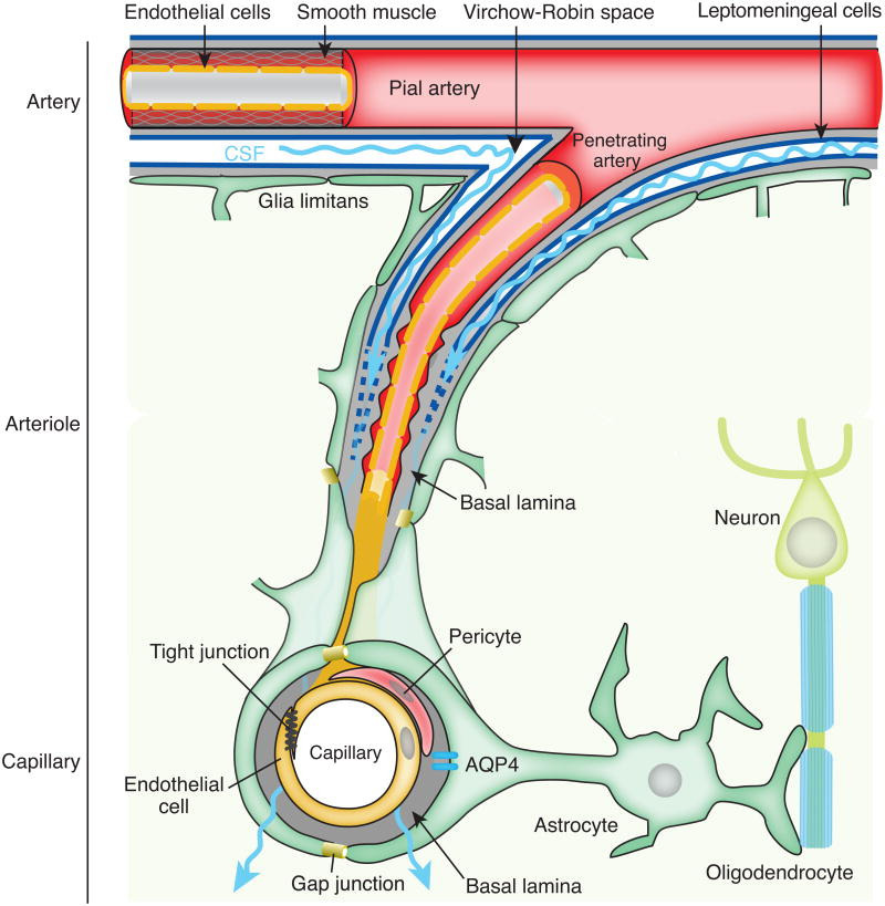 The structure and function of the neurovascular unit allow bidirectional communication between the microvasculature and neurons, with astrocytes playing intermediary roles. Pial arteries in the subarachnoid space bathed in CSF become penetrating arteries upon diving into the brain parenchyma. The perivascular space around penetrating arteries is termed the Virchow-Robin space. As the penetrating arteries branch into arterioles and capillaries the CSF-containing Virchow-Robin spaces narrow and finally disappear. However, the perivascular space extends to arterioles and capillaries to venules where it is made up by the basal lamina's extracellular matrix that provides a continuity of the fluid space between arterioles and venules. Astrocytic vascular endfeet expressing aquaporin-4 (AQP4) surround the entire vasculature and form the boundary of the perivascular spaces.