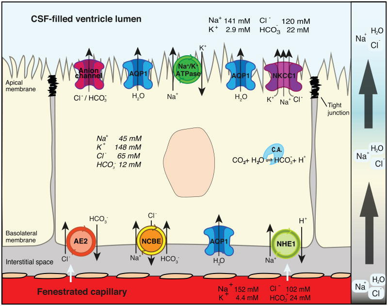 According to the classical hypothesis, ion transporters and channels in the choroid plexus epithelial cells account for the main part of cerebrospinal fluid (CSF) production. The apically expressed Na+/K+-ATPase, central to CSF secretion, creates the electrochemical gradient for Na+ that is imported via the Na+/H+ exchanger, NHE1 and/or the Na+-HCO3- co-transporter, NCBE in the basolateral membrane. Co-import of HCO3- via NCBE and hydration of CO2 by carbonic anhydrase (C.A) increase the intracellular concentration of HCO3-, which creates an electrochemical gradient that drives the efflux of HCO3- via the basolateral-located Cl-/HCO3- exchanger, AE2 and apical HCO3- channels. The operation of AE2 generates a rise in intracellular Cl- driving the apical export of Cl- through the NKCC1 and Cl- channels. The final result of these processes at the choroid plexus epithelium is a net flux of Na+, HCO3- and Cl- from the blood across the epithelium to the ventricles, which generates the osmotic gradient that makes water move through AQP1 thereby producing the CSF.