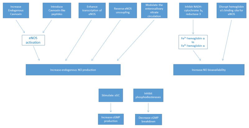 또 다른 종류의 NOsGC-cGMP 경로 조절제는 포스포디에스테라입니다. 이 효소는 cGMP의 포스포디에스테르 결합을 가수분해하여 경로를 억제합니다(174,201). 현재 임상에서 사용되는 포스포디에스테라아제 5 억제제는 실데나필, 바데나필, 타다라필, 아바나필 등 4가지가 있으며, 이 중 실데나필은 cGMP 분해를 억제하는 효과가 있습니다. 이 네 가지 모두 발기부전 치료제로 승인되었습니다. 실데나필과 타다라필은 폐동맥 고혈압에도 사용되며, 타다라필은 양성 전립선 비대증에도 사용하도록 승인되었습니다(174). 비선택적 포스포디에스테라아제 및 cGMP 선택적 포스포디에스테라아제(포스포디에스테라아제 5, 포스포디에스테라아제 6, 포스포디에스테라아제 9) 억제제를 포함한 추가적인 포스포디에스테라아제 억제제 개발을 위한 연구가 진행 중입니다(174).