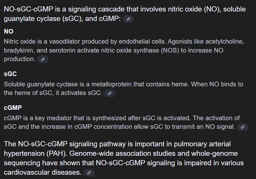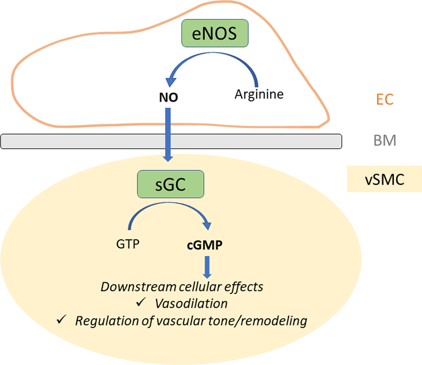 이그나로와 동료들은 sGC 활성화제인 프로토포르피린 IX에 의해 sGC 활성이 NO와 독립적인 방식으로 조절될 수 있음을 보여주었습니다(190). 프로토포르피린 IX는 심각한 광과민성 효과로 인해 임상적으로 사용되지 않았습니다(174). 그러나 최근에 개발된 시구아트라고 하는 약물도 NO와 독립적인 방식으로 유사하게 NO-sGC-cGMP 경로를 조절합니다(174). 시구아트에는 두 가지 하위 그룹이 있습니다: NOsGC 자극제(NOsGC와 결합하여 알로스테릭 조절을 통해 작용)와 NOsGC 활성화제(NOsGC의 헴 결합 부위를 차지하고 NO와 부가적으로 작용)입니다(174). 리피시구아트는 새로운 혈소판 응집 억제제를 확인하기 위해 고안된 저분자 스크리닝에서 토끼 혈소판의 sGC를 자극하는 것으로 밝혀진 최초의 NOsGC 자극제였습니다(191). 리시구아트의 용해도와 효능을 개선하기 위한 추가 연구를 통해 임상용으로 승인된 유일한 NOsGC 자극제인 리오시구아트가 개발되었습니다(192). 리오시구트는 현재 폐동맥 고혈압 및 수술 불가능한 만성 혈전색전성 폐고혈압 치료제로 승인되었습니다(174,193,194). 폐 고혈압 및 심부전 치료에서 리오시구아의 잠재적 역할에 대한 임상시험이 진행 중입니다. 연구 중인 다른 NOsGC 자극 시구아트로는 만성 수축기 심부전 악화 환자에서 N-말단 프로-B형 나트륨이뇨펩타이드(NT-proBNP)의 순환 수준을 감소시키는 것으로 나타난 베리시구아트를 비롯하여 넬로시구아트, IW-1973 및 IW-1701(174,195,196)이 있습니다.