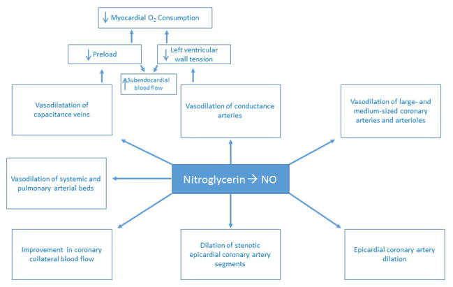 The use of nitroglycerin in the treatment of angina pectoris began not long after its original synthesis in 1847. Since then, the discovery of nitric oxide as a biological effector and better understanding of its roles in vasodilation, cell permeability, platelet function, inflammation, and other vascular processes have advanced our knowledge of the hemodynamic (mostly mediated through vasodilation of capacitance and conductance arteries) and non-hemodynamic effects of organic nitrate therapy, via both nitric oxide-dependent and independent mechanisms.