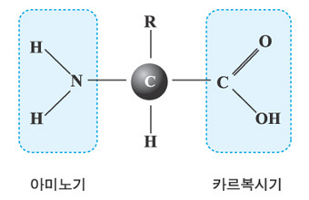 단백질의 소단위 단위체는 아미노산(amino acid)이다. 그러므로 단백질은 아미노산의 중합체이다. 1개를 제외한 모든 단백질은 아미노산의 중합체이다. 1개의 프롤린을 제외한 모든 아미노산은 분자내의 말단 탄소에 아미노기(-NH2)와 카르복실기(-COOH)가 결합되어 있다. 이 말단 탄소의 세번째 결합은 수소원자와 연결되어 있고, 네번째 것은 아미노산 곁사슬(amino acid side chain : 이 식에서 R로 표시)이라 불리는 나머지 분자와 결합되어 있다.이 곁사슬은 상대적으로 작은데, 하나의 수소원자로부터 수소원자를 가진 9개의 탄소원자에 이르기까지 다양하다.