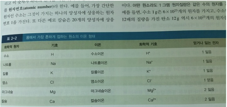 수소와 기타 많은 원자들은 쉽게 이온을 형성한다. 표 2-2는 신체에서 보이는 몇몇 원소들의 이온형태를 나타낸 것이다. 순 양전하를 띤 이온은 양이온(cation)이라고 한다. 이들이 지닌 전하때문에 이온들은 물에 용해되었을때 전기를 전도할 수 있다. 따라서 무기질 원소의 이온형태를 총괄하여 전해질(electrolyte)이라고 한다.