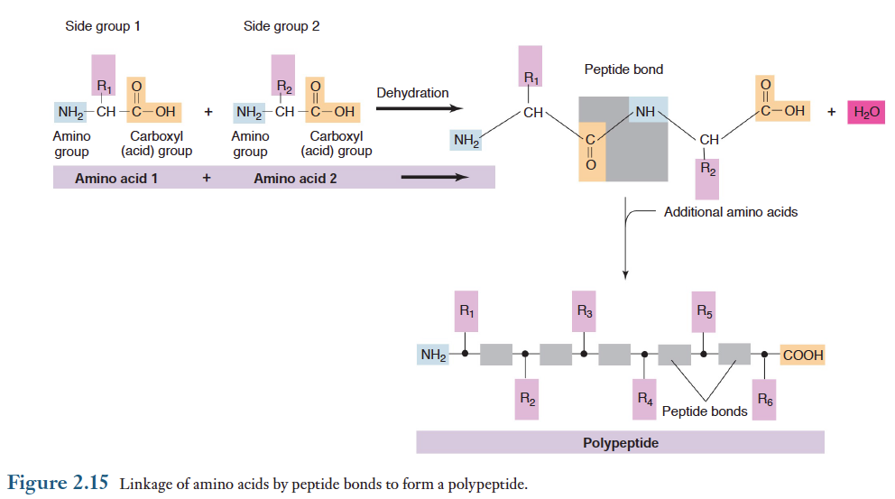 그림에서 유념해야 할 것은 2개의 아미노산이 서로 결합될때, 만들어진 분자의 한쪽 말단은 자유 아미노기를 가지고 있고, 다른 말단은 자유 카르복실기를 가지고 있다는 것이다. 부가되는 아미노산들은 이 자유 말단에 펩티드 결합으로 연결될 수 있다. 펩티드 결합으로 연결된 아미노산의 배열은 폴리펩티드로 알려져 있다. 펩티드 결합은 폴리펩티드의 기본골격을 형성하고, 각 아미노산의 곁사슬은 사슬로부터 돌출해 있다. 다시말하면, 폴리펩티드라는 용어는 구조적인 단위를 나타내는 것이지 이 분자가 기능적인 것을 반드시 제시하는 것은 아니다. 일반적으로 폴리펩티드 내의 아미노산의 수가 50개 또는 그 이하이고, 알려진 생물학적 기능을 갖고 있으면, 이 분자를 간단히 펩티드라고 하며, 이를 이 책의 관련된 곳에서는 어디서나 그렇게 사용할 것이다.