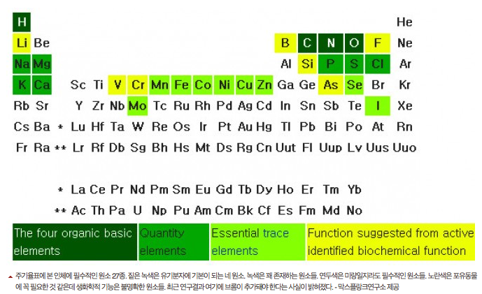 주요원소 4가지 : 수소(63%), 수소(26%), 탄소(9%), 질소(1%) = 체내 전체원자의 99.3%