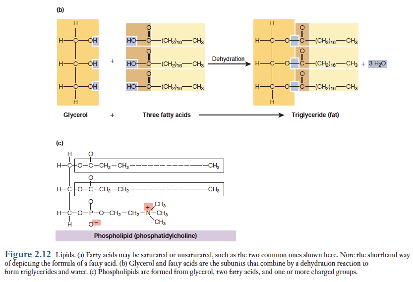지질은 주로 수소와 탄소원자로 구성된 분자이다. 이들 원자들은 비극성 공유결합에 의해서 연결되어 있다. 그러므로 지질은 비극성이고 물에 용해도가 매우 낮다. 평균하여 신체 유기물질의 약 40%를 차지하고(체중의 15%)있는 지질은 지방산, 트리글리세라이드, 인지질, 스테로이드의 네가지 하위분류군으로 나눌 수 있다. 탄수화물과 같이 일부지질은 유용한 에너지원을 제공하기 때문에 지질은 생리학에서 매우 중요하다. 다른 지질들은 모든 세포막의 주요성분이고 또 다른 것은 신호전달 분자로 중요하다.