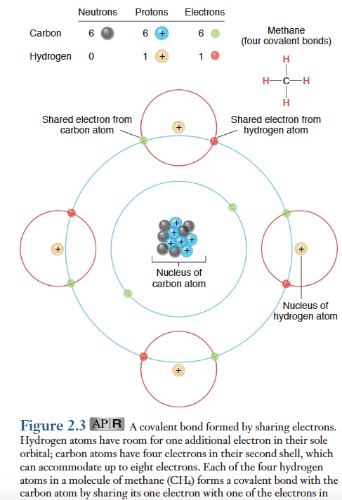 그림에서 보는 바와같이 첫번째 전자껍질에 2개의 전자 그리고 바깥쪽 껍질에 4개의 전자를 지닌 탄소가 4개의 수소원자와 공유결합을 형성함. 원자의 두번째 에너지 껍질에는 8개의 전자를 갖고 있을 수 있다는 사실을 상기하라. 탄소는 모두 6개의 전자를 갖고있는데, 첫번째 에너지 껍질을 채우는데는 2개의 전자를 사용하였기 때문에 두번째 껍질에는 오직 4개만을 갖고 있음. 그러므로 바깥쪽 껍질에 4개의 전자를 더 채울 수 있는 여유가 있음. 수소는 단 하나의 전자를 지니고 있고 모든 궤도와 마찬가지로 수소 1개의 에너지 궤도로 2개의 전자까지 채울 수 있음. 그러므로 수소도 또한 1개의 전자를 더 채울 수 있는 공간이 있음. 이 예에서 1개의 탄소원자는 다른 4개의 수소원자들과 4개의 전자를 공유하고 마찬가지로 수소원자들은 탄소원자와 그들의 전자를 공유함. 공유한 전자들은 양 원자 주위를 궤도를 그리며 돌면서 서로 결합하여 메탄(CH4)분자가 됨. 이들 공유결합은 신체에서 가장 강력한 결합으로 한번 형성되면 일반적으로 열과 같은 에너지원이나 효소로 처리하지 않는 한 서로 분리되지 않음.