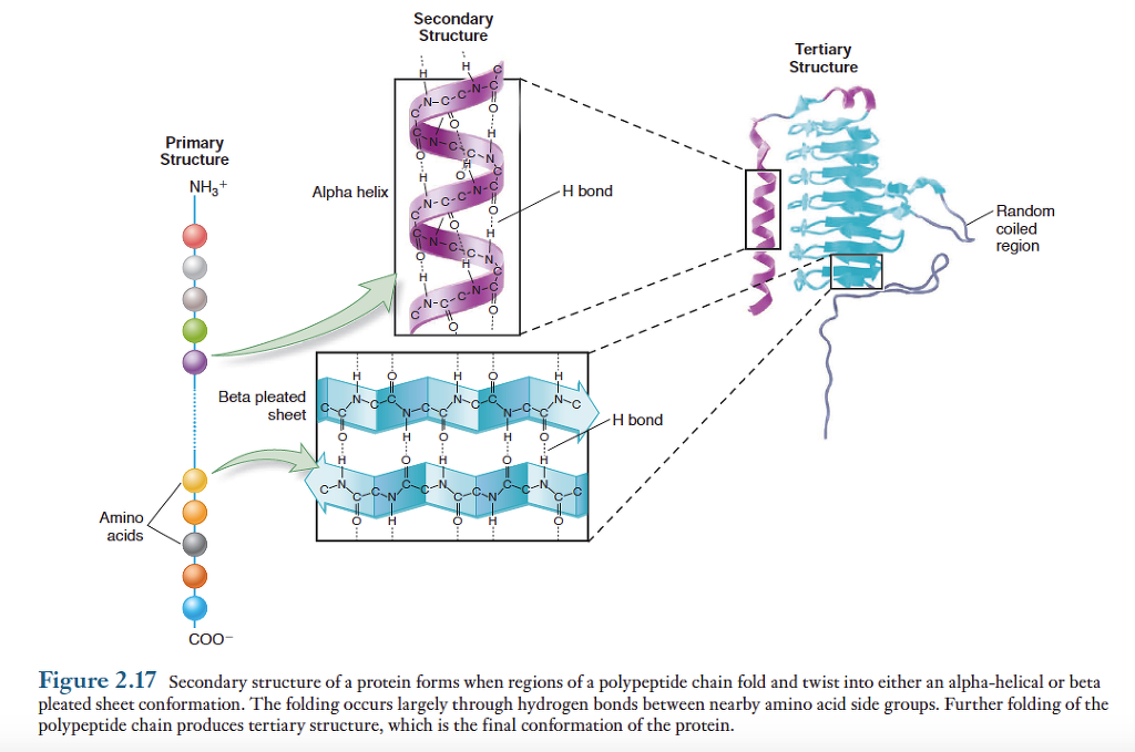 폴리펩티드 사슬에 따라 여러부위들 사이의 인력은 단백질의 2차구조를 만든다. 예를들면, 수소 결합은 한 펩티드 결합에 있는 질소원자에 결합된 수소와 다른 펩티드 결합에서 이중 결합된 산소원자 사이에서 일어날 수 있다. 그림. 펩티드 결합이 폴리펩티드 사슬을 따라 일정한 간격을 두고 생기기 때문에 그들 사이의 수소결합은 고리를 알파 나선(alpha helix)라고 알려진 사슬이 꼬인 입체구조로 되게 하는 경향이 있다. 수소결합은 또한 펩티드 결합들 사이에서 폴리펩티드 사슬의 연장된 부위가 거의 서로 평행되게 나아갈때에도 형성될 수 있는데 이렇게 비교적 곧게 뻗어나간 부위를 베타 병풍(peta pleated sheet) 구조라고 한다.