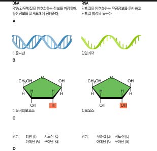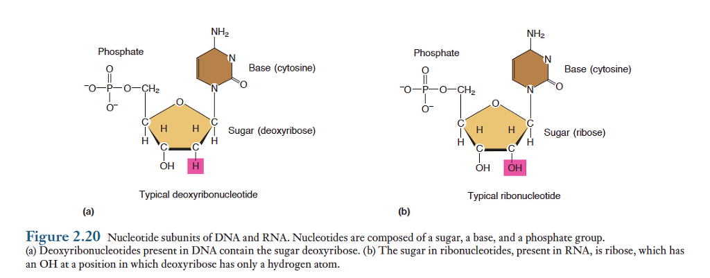 핵산의 두가지 유형은 모두 중합체이고 반복되는 소단위의 선형 서열로 구성되어 있다. 각 소단위는 뉴클레오티드(nucleotide)라고 알려져 있는데, 인산기, 당, 수소이온을 받을 수 있기 때문에 염기로 알려진 탄소와 질소원자로 된 고리의 세가지 구성요소로 되어 있다. 그림 2.20