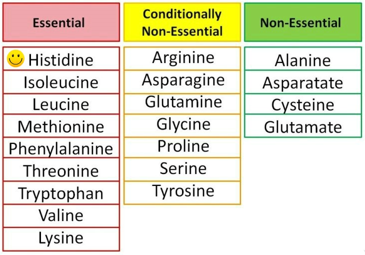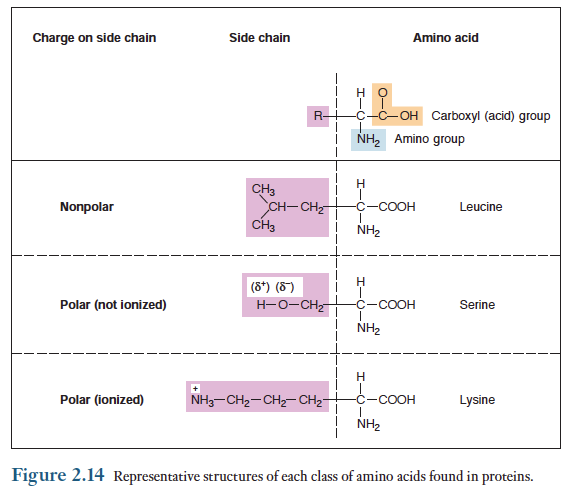 살아있는 모든 생명체의 단백질은 20가지의 서로 다른 곁사슬을 가진 20가지의 서로 다른 아미노산들로 구성되어 있다. 곁사슬은 비극성(8종의 아미노산), 극성(7종의 아미노산) 혹은 이온화된 것(5종의 아미노산)일 수 있다. 인체는 많은 아미노산을 합성할 수있지만, 몇가지는 음식으로 반드시 섭취해야 하는데 이를 필수 아미노산이라고 한다.