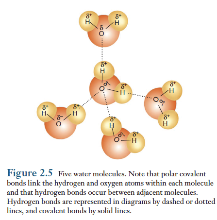 물은 신체내에서 가장 흔한 분자이다. 100개 분자중 99개가 물이다. 물 분자에서 2개의 수소원자를 산소원자에 연결한 공유결합은 극성이다. 그러므로 물에서 산소는 부분 음전하를 띠며 각 수소는 부분 양전하를 띤다. 한 물 분자의 수소원자 인근의 양성 극성부위는 인접한 물 분자의 산소원자의 음성 극성부위를 전기적으로 끌어당겨 수소결합을 이룬다.