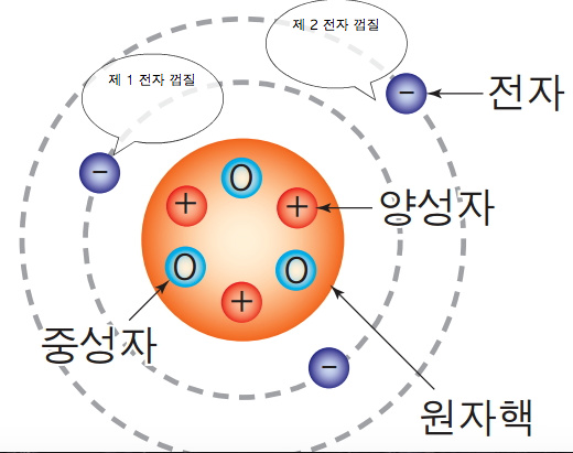 원자의 화학적인 특성은 세가지 원자내의 입자인 양성자(proton), 중성자(neutron), 전자(electron)이라는 용어로 설명할 수 있다. 양성자와 중성자는 원자 중심 즉 원자핵(atomic nucleus)의 아주 작은 부피에 국한되어 있다. 전자는 핵으로부터 다양한 거리에 있는 궤도(orbital)을 따라 회전한다. 각각의 궤도는 2개의 전자만 붙잡을 수 있고 더이상은 불가능하다. 원자가 보다 커지면 더 많은 전자를 가지므로 핵 주위에 더 많은 궤도가 있게 된다. 원자가 점점 더 커짐에 따라 핵으로부터 더 먼거리에 있는 에너지 껍질에서 궤도를 볼 수 있다. 다른 껍질에 있는 전자들은 다른 에너지 양을 지닌다는 관찰로부터 껍질의 이름이 유래되었다. 탄소와 같은 원자는 하나의 전자를 지닌 수소보다 더 많은 에너지 껍질을 지니지만 보다 많은 전자를 지닌 철과 같은 원자보다는 훨씬 적은 것을 가진다.