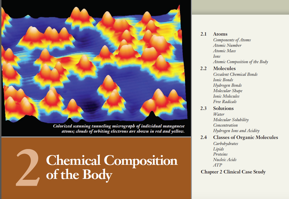 원자와 분자는 세포구조와 기능의 화학적 단위다. 이 장에서 우리는 인체내의 주된 화학물질의 두드러진 특징들에 대해 설명한다.