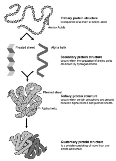 모든 단백질은 다단계의 구조를 지니고 있으며 각 단백질은 독특한 모양으로 주어진다. 이들을 1차, 2차, 3차 구조라하고 일부의 단백질에서는 4차구조도 있다. 단백질의 모양이 생물학적 활성을 결정한다. 모든 경우에서 단백질의 모양은 아미노산의 서열인 단백질의 1차구조에 의존한다.