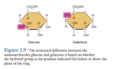 첫번째는 유기분자들의 구조를 그리는 전통적 방식이지만 두번째는 그들의 3차원적 형태를 보다 잘 표현해줌. 5개의 탄소원자와 하나의 산소원자는 본질적으로 편평한 평면에 놓이는 고리를 형성함. 각 탄소의 수소와 수산기는 이 고리의 평면위와 아래에 놓여있음. 고리 아래쪽의 수산기 하나가 고리위로 이동하면 그림에서 보는 것과 같은 단당류가 만들어짐.