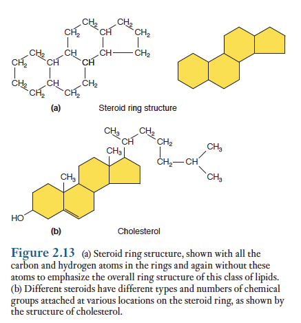 스테로이드는 다른 지질분자의 하위 분류와는 명백히 다른 구조를 가진다. 4개의 상호 연결된 탄소원자들의 고리는 모든 스테로이드의 골격을 형성한다. 극성을 띠는 몇개의 수산기가 이 고리 구조에 붙어 있지만, 스테로이드를 수용성으로 만들기에는 수적으로 충분하지 않다. 스테로이드의 예로써 콜레스테롤, 부신에서 생성된 코르티솔, 생식선으로부터 분비된 여성(에스트로겐)과 남성(테스토스테론) 호르몬이 있다.