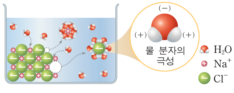 물에 용해되기 위해서 물질은 전기적으로 물분자에 끌어당겨져야 한다. 예를들면, 소금 NaCl은 양성 나트륨 이온과 음성 염소이온사이에 강한 전기적인 인력으로 인한 고체결정 물질이다. 2개의 반대로 하전된 이온사이의 이러한 강한 인력을 이온결합이라고 한다. 염화나트륨의 결정이 물에 들어가면 극성인 물분자는 하전된 나트륨과 염소이온에 끌어당겨지게 된다. 이온은 물분자의 무리에 둘러싸이게 되면서 나트륨과 염소이온이 소금결정으로부터 분리되어 물에 들어가 용해된다.