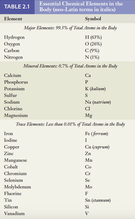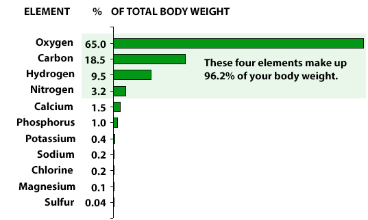 신체의 단지 4개의 필수원소 수소, 산소, 탄소, 질소가 신체내 원자의 99.3%를 차지한다. 7개의 필수 무기질 원소들은 세포내외 용액에 녹아 있는 가장 많은 물질이다. 그러나 대부분 몸의 칼슘과 인 원자는 뼈조직의 고형기질을 만든다. 13개의 필수 미량원소(trace element)는 극단적으로 아주 적은 양이 존재하지만, 그럼에도 불구하고 그들은 정상적인 성장과 기능에 필수적이다. 예를들면, 철은 혈액에 의한 산소의 수송에 있어서 결정적인 역할을 한다.
