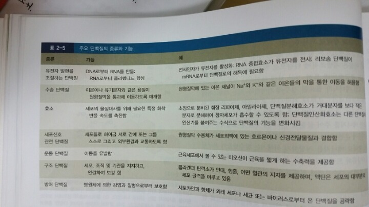 단백질은 몸에서 유기물질의 약 50%를 차지하고 (체중의 17%), 거의 모든 생리적 과정에서 중요한 역할을 한다. 아래 표에서 정리.