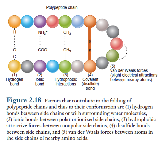 이들은 1) 사슬의 부분들간이나 주위의 물분자들과의 수소 결합 2) 사슬을 따라 극성부위와 이온화된 부위 사이의 이온결합 3) 비극성(소수성) 부위 사이의 인력 4) 2개의 시스테인 아미노산의 황을 지닌 곁사슬을 연결하는 공유 이황화결합(disulfide bond) 그리고 5) 서로 매우 인접한 두 분자들의 가장 바깥쪽 껍질을 선회하는 전자들 사이의 매우 약하고 일시적인 상호작용인 반데르발스힘이다.