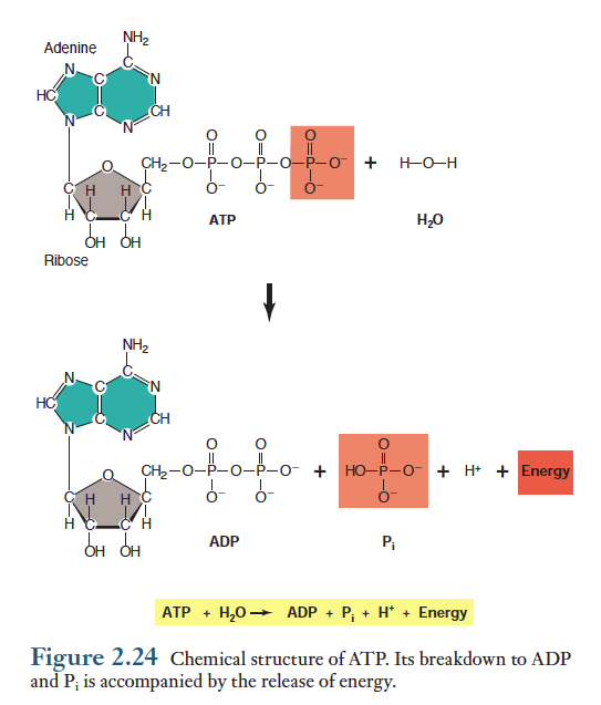 반응산물은 에네노신2인산(adenosine diphosphate, ADP), 무기인산(Pi)과 H+ 이다. ATP의 가수분해로부터 유래한 에너지는 세포에 의해 1) 근육수축에서처럼 힘과 운동의 생산 2) 막을 통한 분자의 능동수송 3) 세포구조와 기능에 사용되는 유기분자의 합성에 사용된다. 우리는 세포가 에너지를 저장하기 위해서가 아니라 에너지를 전달하기 위해서 사용한다는 것을 강조해야만 한다. ATP는 에너지를 필요로 하는 세포과정을 위해 연료분자로부터 상대적으로 적은 양의 에너지를 전달하는 에너지 운반 분자이다.