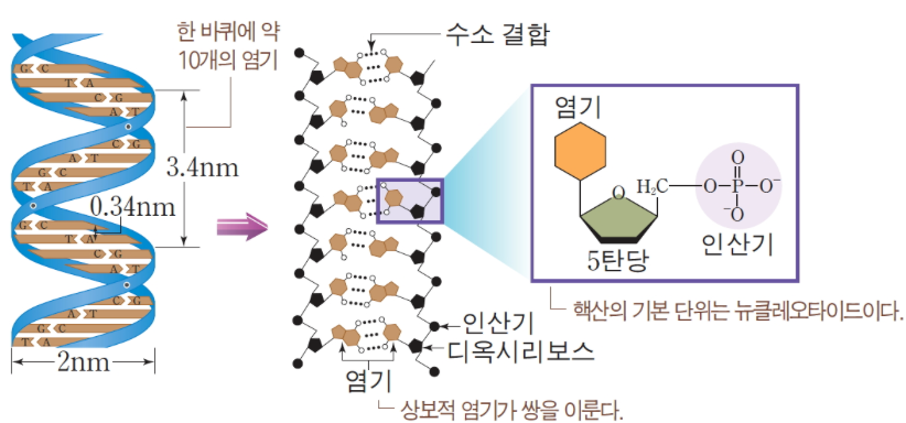 DNA분자는 하나가 아닌 2개의 뉴클레오티드 사슬이 서로 꼬아져 있는 이중 나선형태를 이룬다. 2개의 사슬은 한 사슬의 퓨린염기와 반대사슬의 피리미딘 염기 사이에 수소결합으로 서로 연결되어 있다. 각 염기의 고리구조는 인산-당 골격에 수직인 평면으로 놓여 있어 마치 나선형의 계단과 같다. 이 염기 쌍은 서로 꼬아짐으로써 두 사슬의 당-인산 골격사이에서 일정한 거리를 유지한다.