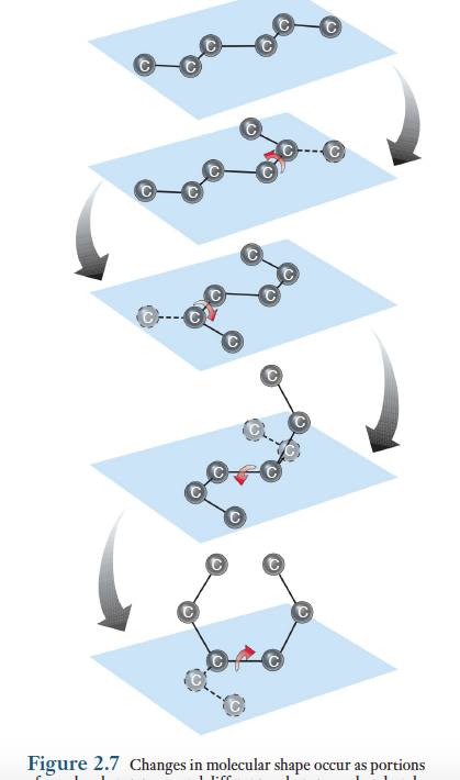 원자들이 서로 연결될때 다양한 모양의 분자들이 형성될 수 있다. 이 분자구조는 3차원적인 것임을 잊지 말아야 한다. 주어진 원자주위에 대칭적이거나 그렇지 않은 형태로 분포한다. 분자들은 단단하지 않고 유연한 구조이다. 어떤 범위안에서 분자의 모양은 원자를 함께 연결하는 공유결합을 깨뜨리지 않고도 변화할 수 있다. 공유결합은 결합된 원자들이 주위를 회전할 수 있는 축과 같다. 앞으로 계속되는 장에서 보겠지만 3차원적인 분자의 유연한 모양은 분자간의 상호작용을 지배하는 주요한 요인 중의 하나이다.