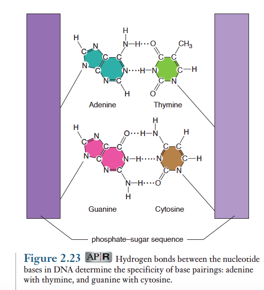 4개의 염기에서 수소결합기의 위치에 따라 염기쌍의 특이성이 부여된다. 퓨린 구아닌과 피리미딘 시토신(G-C쌍) 사이에 3개의 수소결합이 형성되는데 반하여, 퓨린 아데닌과 피미미딘 티민(A-T쌍) 사이에서는 단지 2개의 수소결합이 형성된다. 결과적으로 G는 항상 C와 A는 T와 쌍을 형성한다. 이 특성이 유전정보를 복제하고 전달하는 메커니즘을 제공한다.