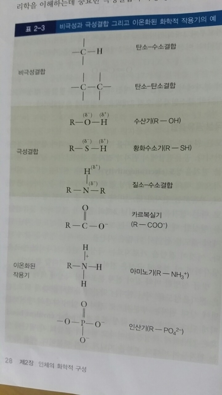 전자에 대해 상대적으로 강한 인력을 가지는 산소, 질소, 그리고 황원자는 수소원자와 극성결합을 형성함. 아래표. 생리학을 이해하는데 중요한 극성 결합의 특징 중 하나는 극성결합을 하는 분자는 다음에 설명할 주된 공유결합의 형태를 지닌 분자들보다 물에 더 잘 녹는 경향을 갖는다. 그 결과 이런 분자들을 소위 극성분자(polar molecule)라 하고 혈액, 세포간 용액, 세포내액에 쉽게 녹는다. 그뿐 아니라 물 자체는 부분적으로 음전하를 지닌 1개의 산소원자와 부분적으로 양전하를 지닌 2개의 수소원자로 이루어진 전형적인 극성분자의 예가 된다.