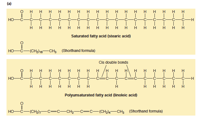 지방산은 한쪽 말단에 산성인 카르복실기를 가지고 있는 탄소와 수소원자의 사슬로 구성되어 있다. 그런 이유때문에 지방산은 탄소와 수소의 구성요소에 덧붙여 2개의 산소원자를 함유한다. 지방산은 신체의 세포내에서 2개씩으로 된 탄소 분절들이 서로 연결하여 합성되기 때문에, 그 결과 16 혹은 18개의 탄소원자로 된 지방산이 가장 일반적이다. 지방산의 모든 탄소가 단일 공유결합에 의해 연결되어 있을때 그 지방산을 포화지방산(saturaded fatty acid)이라 하는데, 이는 각각의 탄소원자에 남아있는 결합이 가능한 2개가 H로 공유적으로 연결되어 모두 채워져 포화되어 있기 때문이다.